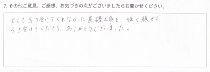 どこも引き受けてくれなかった基礎工事を、嫌な顔せず引き受けてくださり、ありがとうございました。(西宮市)